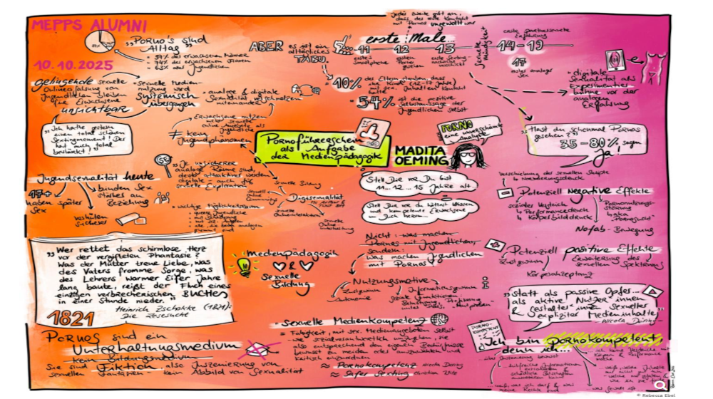 Die Sexual- und Medienpädagogin Madita Oeming gab im Auftaktvortrag zum Thema „Porno-Führerschein als Aufgabe der Medienpädagogik“ Einblicke in ihr bald erscheinendes Buch „Aufgeklärt statt aufgeregt“, das Eltern unterstützt, ihre Kinder durch die digitale Pubertät zu begleiten. Sie sprach sich für einen realistischen und tabufreien Blick auf den Stand der sexuellen Entwicklung und Bildung von Jugendlichen aus und betonte, dass angesichts der Verbreitung von digitalen Endgeräten und Zugängen ein Schulterschluss zwischen Sexualpädagogik und Medienbildung nötig ist. Kinder und Jugendliche, so Oeming, beheimaten sich immer früher in digitalen Welten und begegnen dort auch sexuellen Inhalten. Neben einem konsequenten Kinder- und Jugendmedienschutz bedürfe es daher auch der Förderung von Pornokompetenz. Diese umfasse u.a. einen bewussten Umgang mit der Inszeniertheit von pornographischen Bild- und Filmerzeugnissen, eine Reflexion auf die eigenen sexuellen Bedürfnisse und Grenzen sowie ein Wissen über die Rechte von Kindern und Jugendlichen im digitalen Raum. „Das ist noch ein langer Weg, aber machbar“, hält sie mit Blick auf ihre Utopie sexueller Medienbildung zum Abschluss des Vortrags fest.