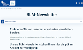 Mit dem Newsletter der Bayerischen Landeszentrale für neue Medien (BLM) erhalten Interessierte regelmäßig aktuelle Informationen zu Medienpolitik, Regulierung und Entwicklungen in der digitalen Medienlandschaft. Der Newsletter bietet Einblicke in Projekte, Studien und Veranstaltungen der BLM und informiert kompakt über relevante Themen im Medienbereich. Eine Anmeldung ist online möglich.
