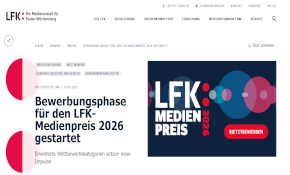 Ab sofort und bis zum 18. November 2025, 12 Uhr, können Beiträge für den LFK-Medienpreis 2026 eingereicht werden. Die LFK lädt alle Medienschaffenden herzlich ein, sich zu beteiligen und die Qualität und Vielfalt der Medienlandschaft in Baden-Württemberg sichtbar zu machen. Weitere Informationen zur Ausschreibung sowie die Teilnahmebedingungen stehen hier zur Verfügung.