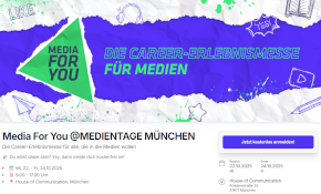 Vom 22. bis 24. Oktober 2025 lädt die Messe Media For You im Rahmen der Medientage München Schüler:innen und Auzubildende ein, die Vielfalt der Medienwelt kennenzulernen. In Workshops, Talks und Praxisformaten gibt es Einblicke in Berufsfelder, Bewerbungstipps und Möglichkeiten zur Vernetzung mit Expert:innen aus der Branche. Die Teilnahme ist kostenlos. Organisiert wird die Messe von Start into Media, der Initiative zur Medienaus- und -weiterbildung in Bayern, gefördert von der Bayrischen Staatskanzlei und der Bayrischen Landeszentrale für neue Medien.